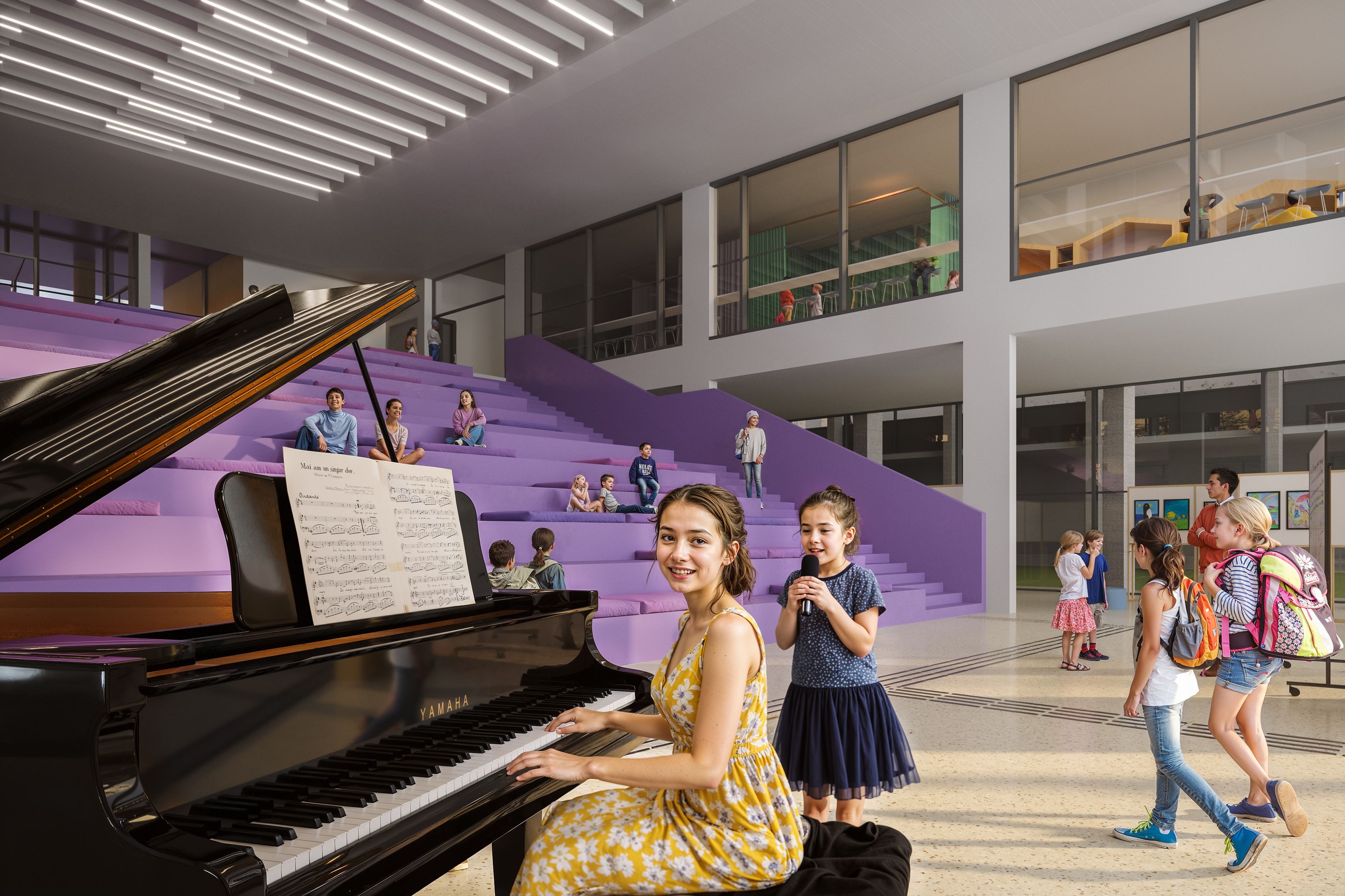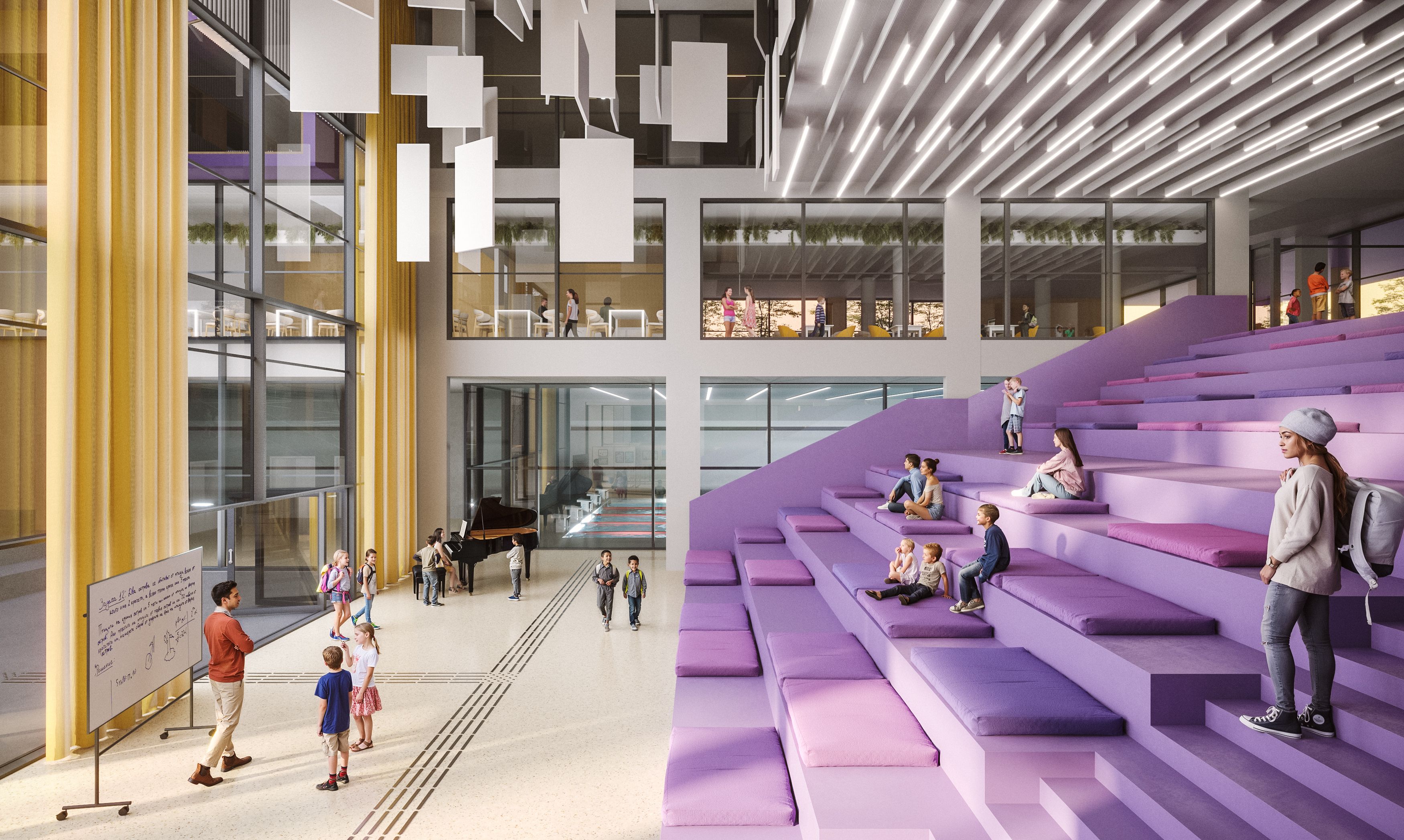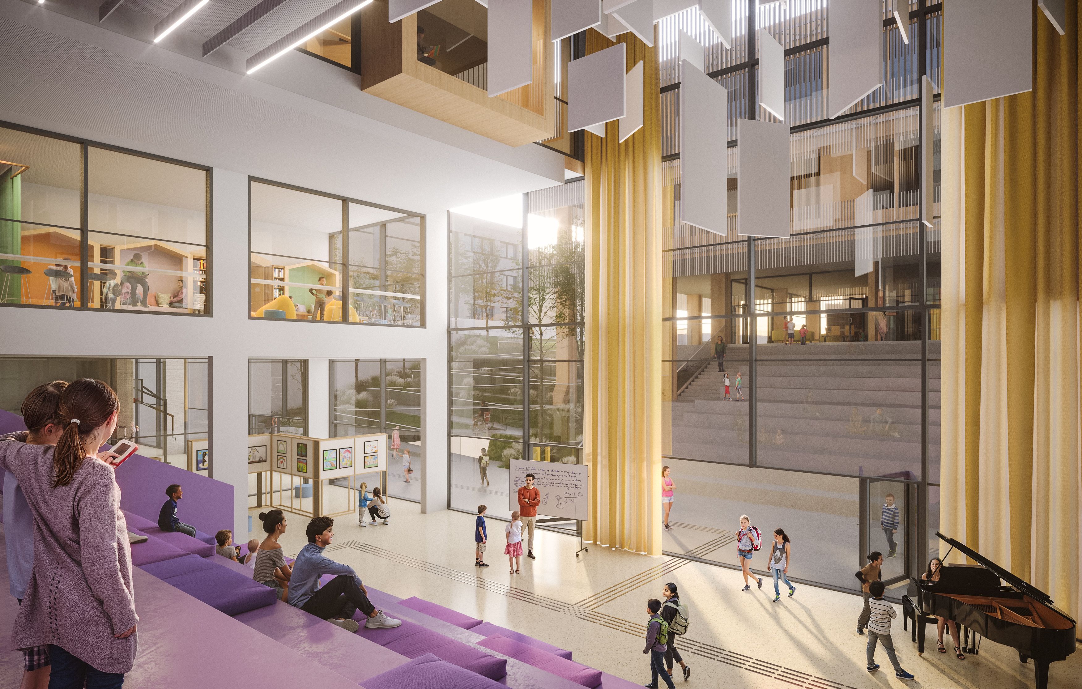 The design is organised around dynamic, multi-functional zones that bridge learning spaces with communal life. At its centre is the Atrium: a large, theatrical welcome space designed to support curricular and extracurricular activities and to extend the school’s presence into a shared civic interior. The Atrium is directly connected to the cafeteria, visually connected to the library, and practically linked to the courtyard—strengthening orientation, visibility, and everyday interaction.